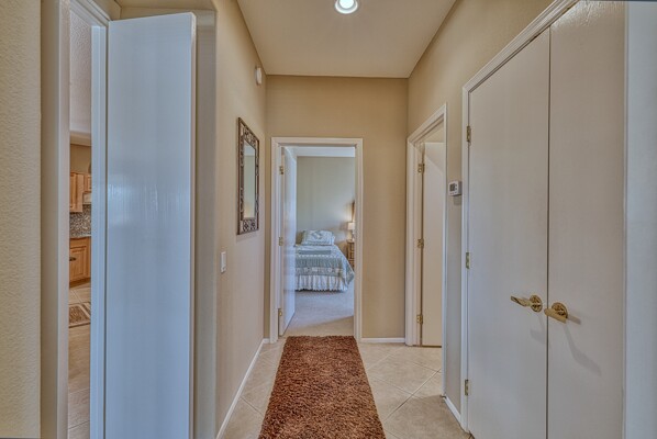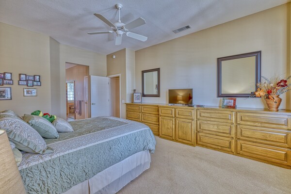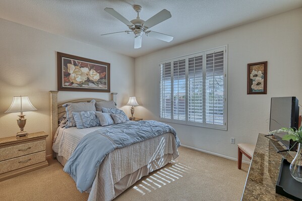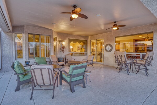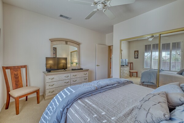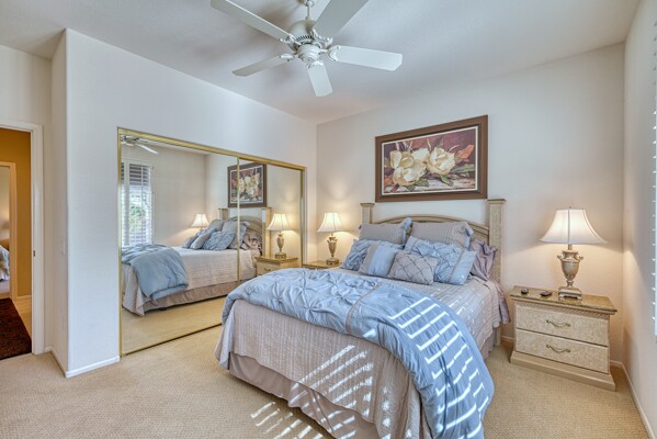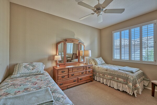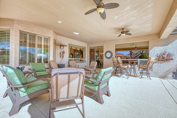 Privacy and serenity abound with a split bedroom layout, remodeled owner's bath and shower, and privacy doors to the guest wing. Extend your living space outdoors and indulge in the expansive patio overlooking a vast common area, offering unparalleled tranquility and majestic mountain views.