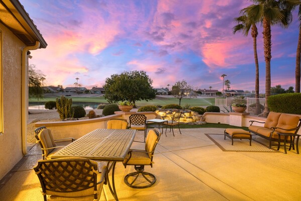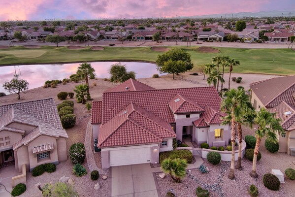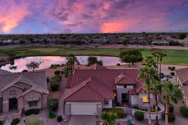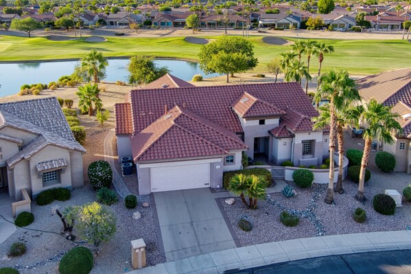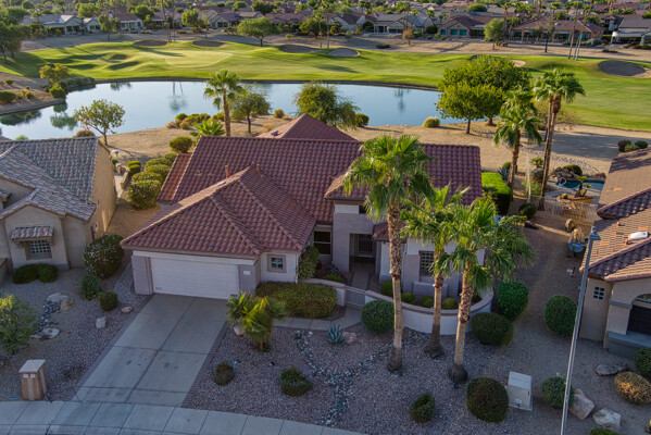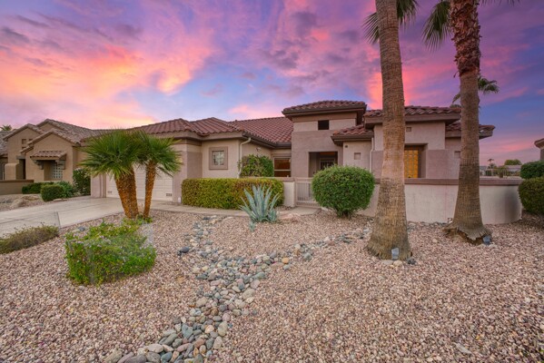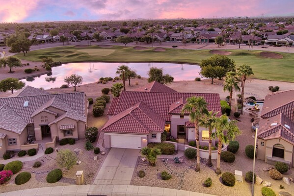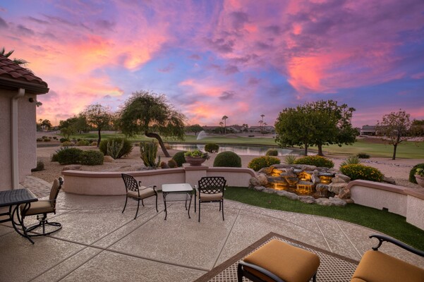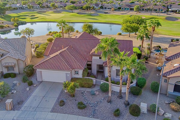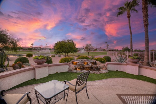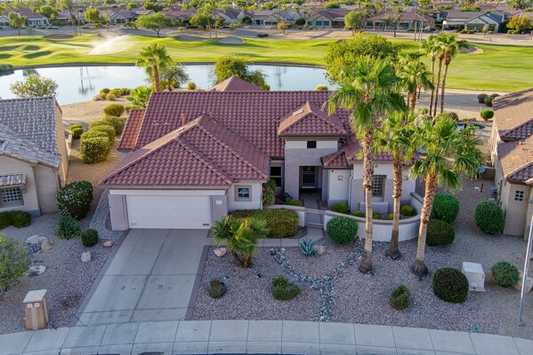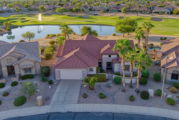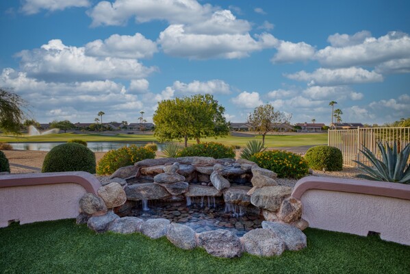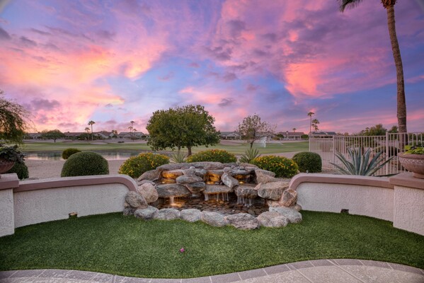 One of the Best Addresses in Sun City Grand if not The Best! Nestled on a Street that was slated to be Model Park 3. This tranquil street is lined wt Premier and Estate Homes only. Half a block away from the vibrant Village Center, golf course, restaurants, fitness center, Palm Center, pools, spa, dog park, tennis, lawn bowling, bocce ball and a plethora of fun events and activities. This Stunning Expanded, Updated Stonecrest overlooks a lake with breathtaking golf course and mountain views and more! Sought after split plan wt spacious additions to all 3 bedrooms and laundry room. Other features are Vaulted Ceiling, Office, Luxury Kitchen wt lots of counterspace, Two and a half car garage, inviting patio wt a wonderful water feature, gas grill, electronic patio cover, professionally landscaped, nice LG washer and dryer, sink and cabinets at laundry plus folding area. Primary has a sitting room overlooking the lake and golf course and door leading to the patio. Primary suite has a garden tub and separate shower, roomy walk-in closet. HVAC units not original. Newer Roof. New Interior Paint. Large Picture windows showcase fabulous views. Newer baseboards. Gutters. Guest Bath Upgraded. PVC piping. Many accent lights added. Solar Tubes and Attic Fan. Vacation Mailbox. Reverse Osmosis. Soft Water. Fall in love with this unique opportunity and make a grand lifestyle. Enjoy the 4 golf courses owned by the residents, 22 pickleball courts, walking and biking trails, fishing and many free get togethers with friends!