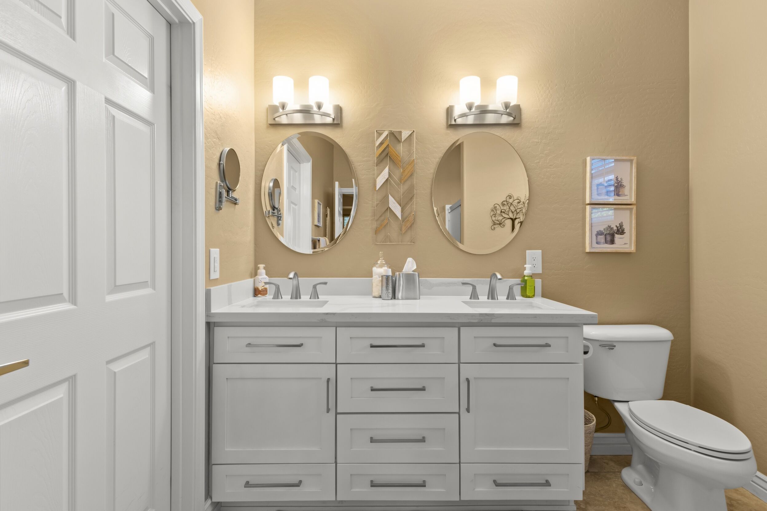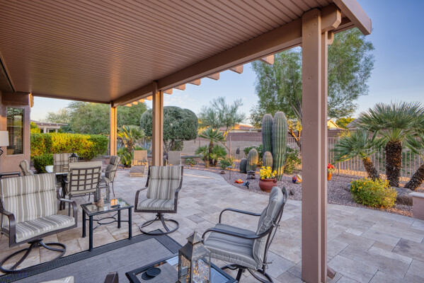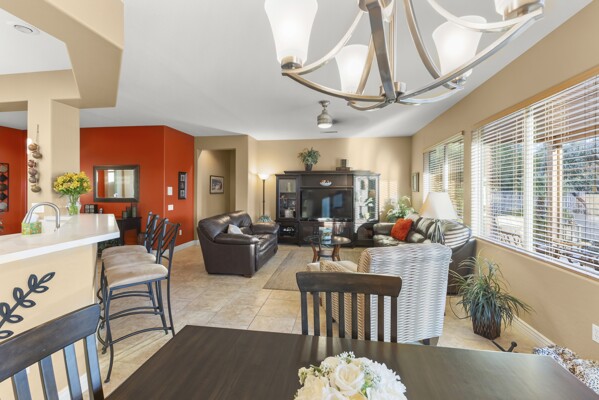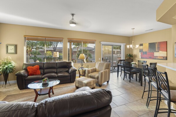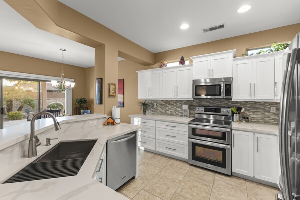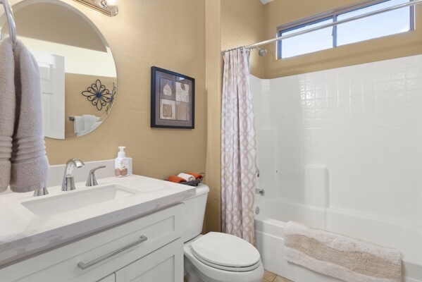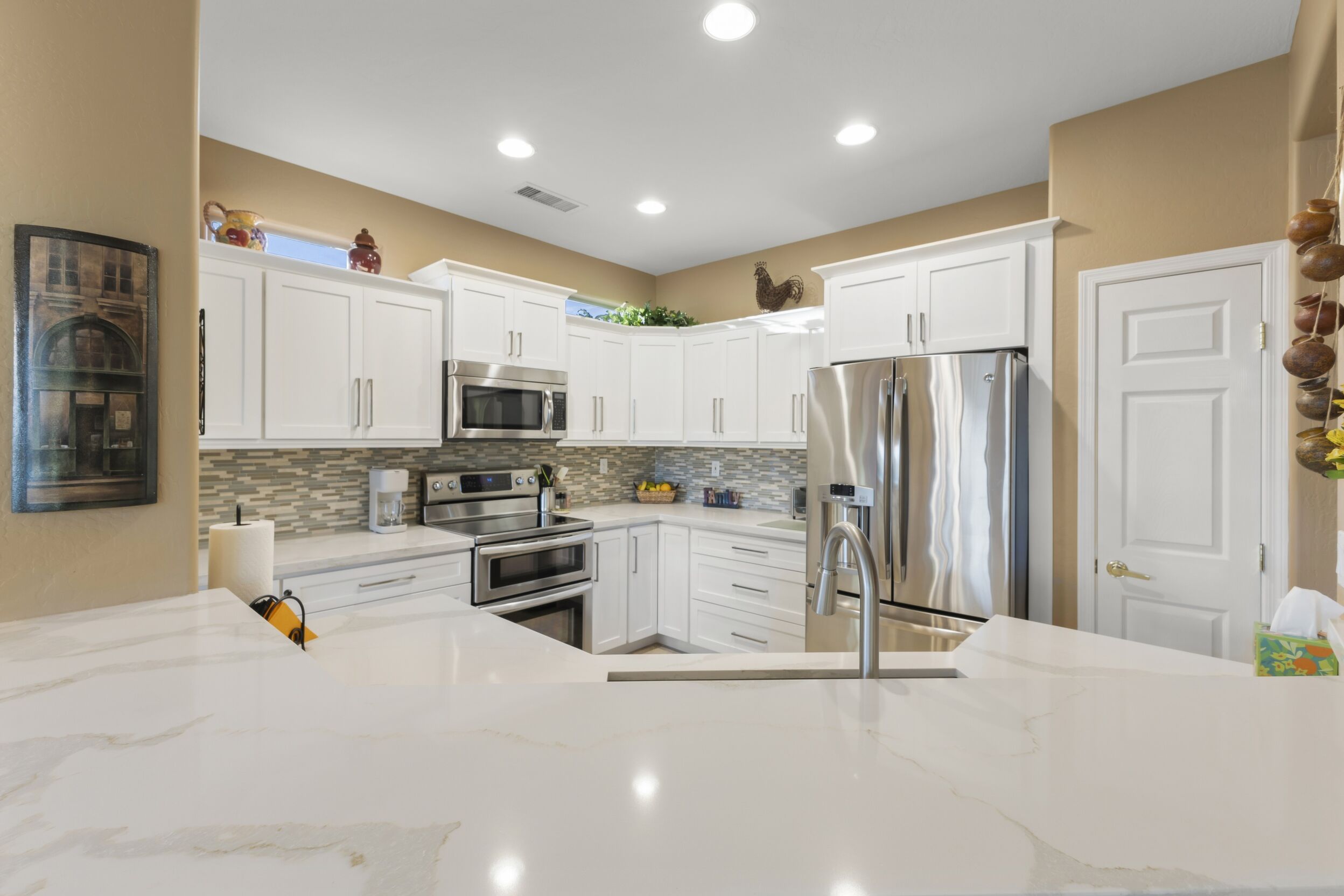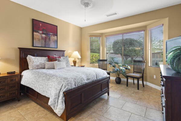The updated bathrooms also feature quartz countertops, while the primary suite and one guest room each include bay windows that allow for ample natural light. The fenced backyard overlooks a serene desert preserve and walking trail—perfect for enjoying Arizona sunsets.