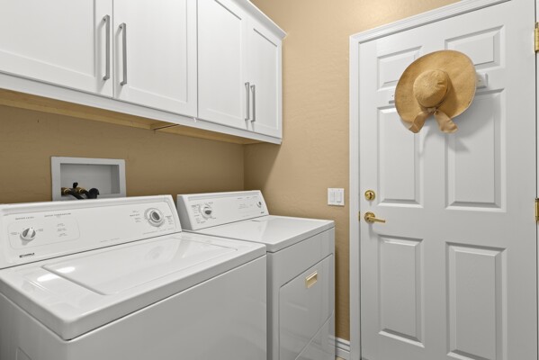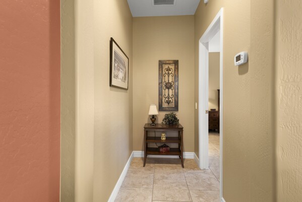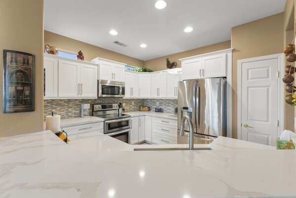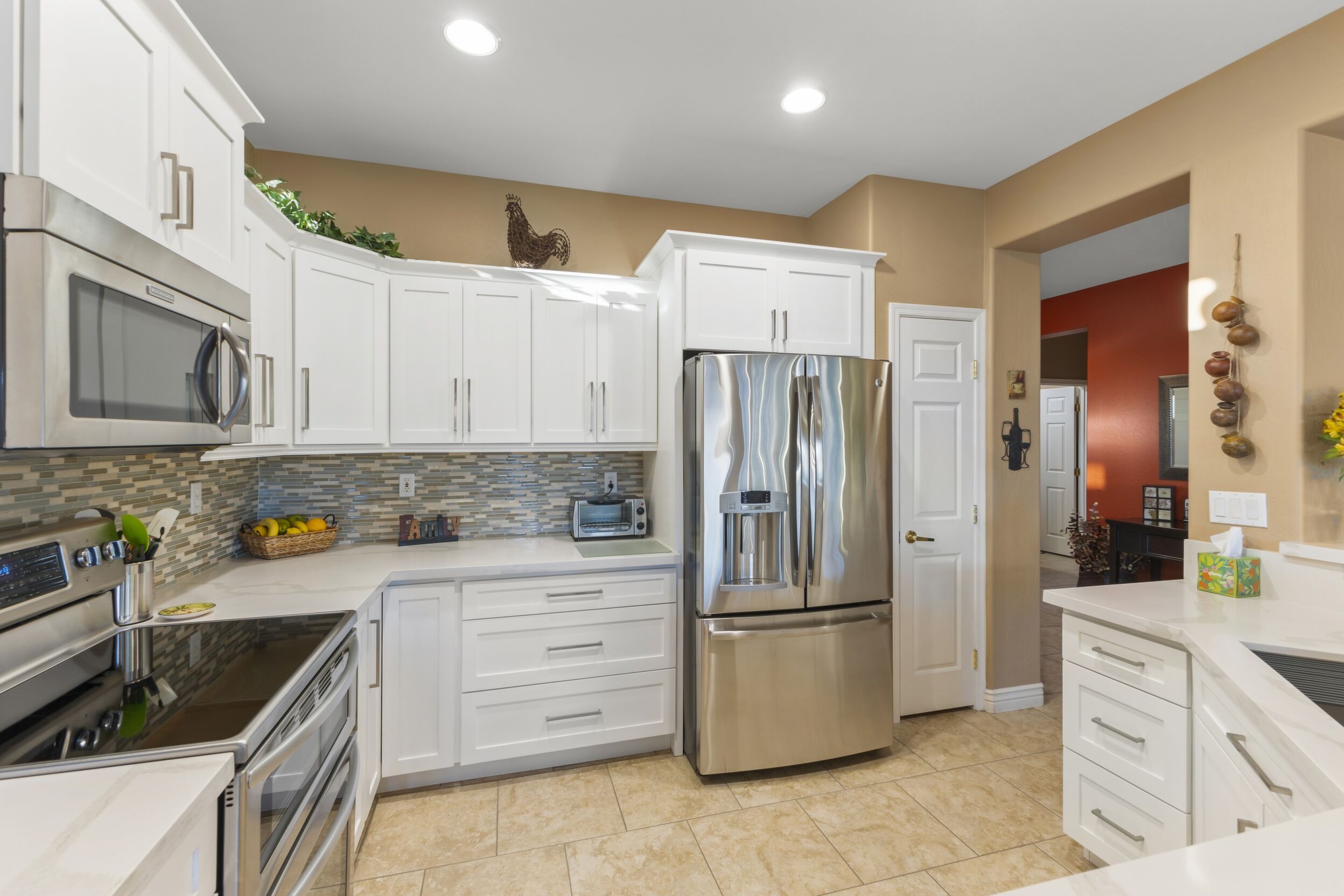 Inside, enjoy a tastefully remodeled kitchen featuring new white cabinetry, quartz countertops, and a glass tile backsplash, along with stainless steel appliances, including a convection and conventional oven. Neutral tile flooring and stylish custom paint enhance the warm atmosphere.
