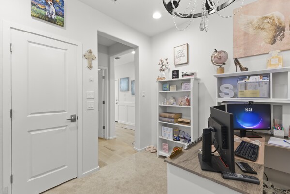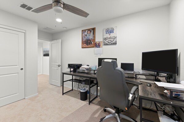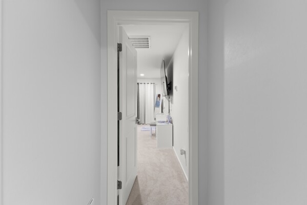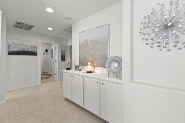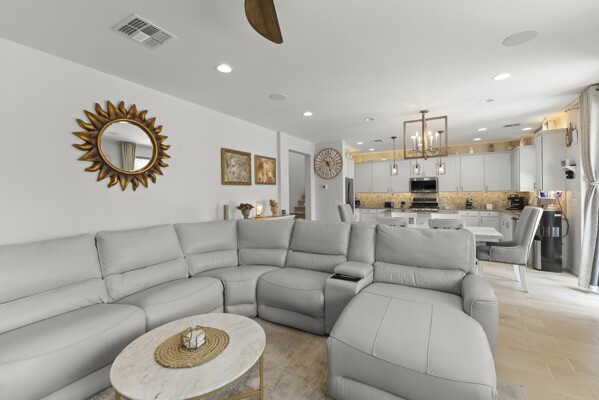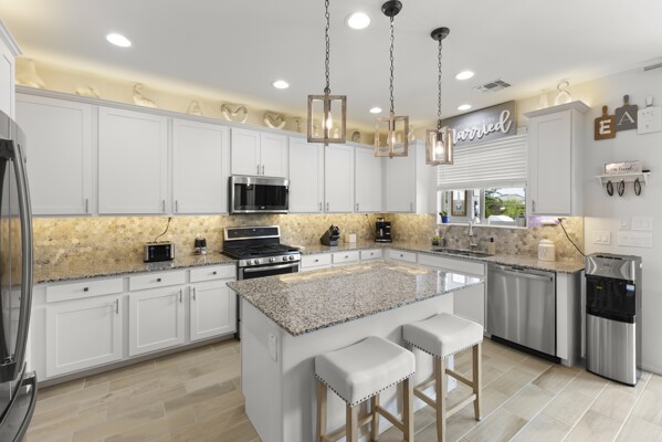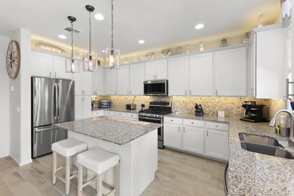 At the heart of the home, the gourmet kitchen shines with white cabinetry, quartz countertops, and a stylish backsplash.