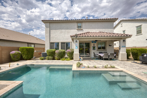 Step outside to a landscaped backyard perfect for entertaining, complete with an expansive patio and sparkling pool.